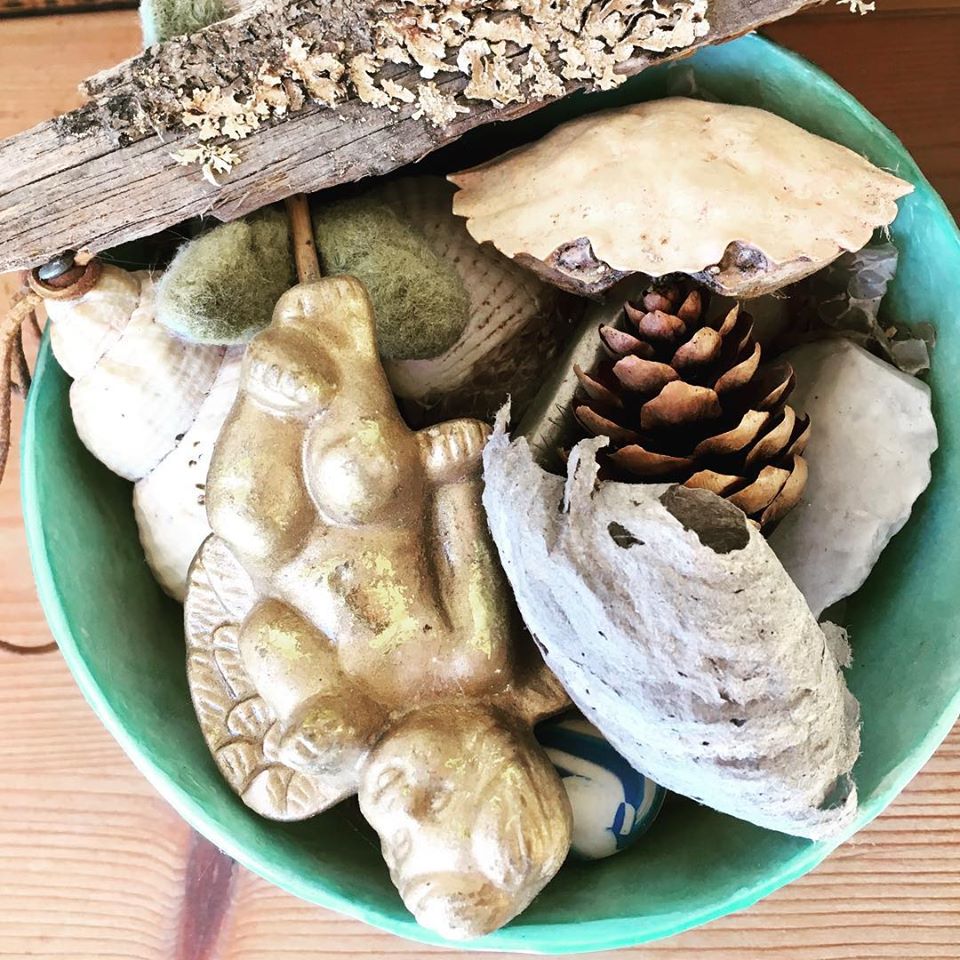 (Mine bedste ‘talismaner’ for mod, kreativitet og styrke: kvinde/frugtbarhedsfigurer fra forskellige tider og steder, mandetorso fundet af Klaus, trold af Ivar Vig og lille hjælper af Mea Josina/Ivar Vig)