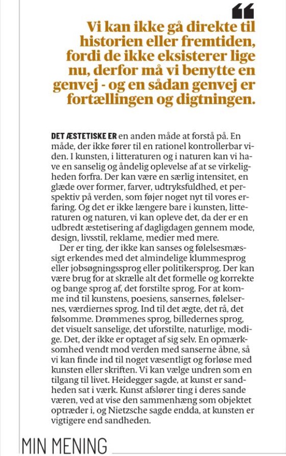 Litteraturen skaber undren og nysgerrighed. Den pirrer intellektuelt og følelsesmæssigt, den starter refleksioner og nye tanker. Fiktionen kan være mere sand end virkeligheden, fordi den kan udtrykke rå, ærlige, autentiske følelser og sansninger.